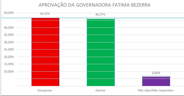 Já a governadora Fátima Bezerra (PT) está se livrando do saldo negativo no aprova x desaprova com aprovação de 46,27% contra desaprovação de 46,93%, um saldo negativo de 0,66 pontos percentuais. 6,8% não souberam responder.