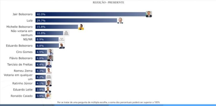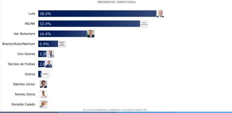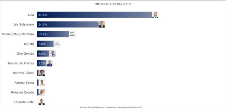 A pesquisa TS2 divulgada pela TCM apontou que o presidente Lula tem 20 pontos percentuais de vantagem sobre o ex-presidente Jair Bolsonaro (PL), que está inelegível e condenado a 27 anos de prisão por tentativa de golpe de estado.