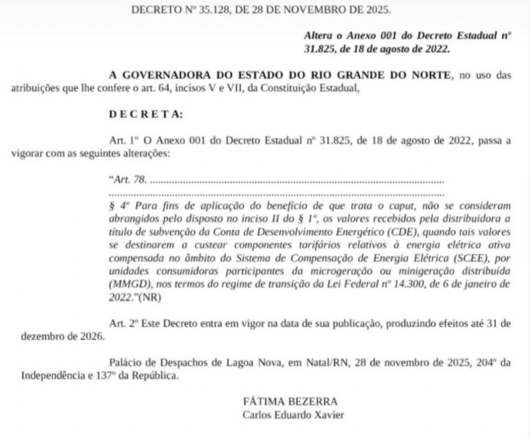 A governadora Fátima Bezerra e o secretário estadual da fazenda Cadu Xavier assinaram o decreto 35.128 de 28 de novembro de 2025 que altera a forma de cobrança do Imposto sobre Circulação de Mercadorias e Serviços (ICMS) para consumidores que utilizam energia solar.