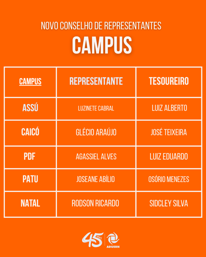 Em Assú, Luzinete Cabral é a representante e Luiz Alberto o tesoureiro; em Caicó, Glécio Araújo assume como representante e José Teixeira como tesoureiro; no Campus de Pau dos Ferros (PDF), os cargos são ocupados por Agassiel Alves, representante, e Luiz Eduardo, tesoureiro; em Patu, Joseane Abílio é a representante e Osório Menezes o tesoureiro; e em Natal, Rodson Ricardo exerce a função de representante e Sidcley Silva a de tesoureiro.
