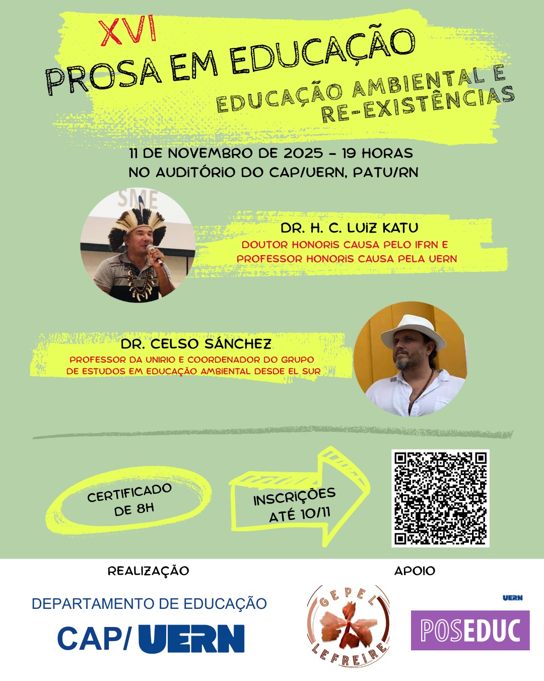 O Departamento de Educação do Campus Avançado de Patu da Universidade do Estado do Rio Grande do Norte (UERN) realiza, no dia 11 de novembro de 2025, às 19h, no Auditório do CAP, a XVI Prosa em Educação, que abordará o tema: “Educação Ambiental e Re-existências”.