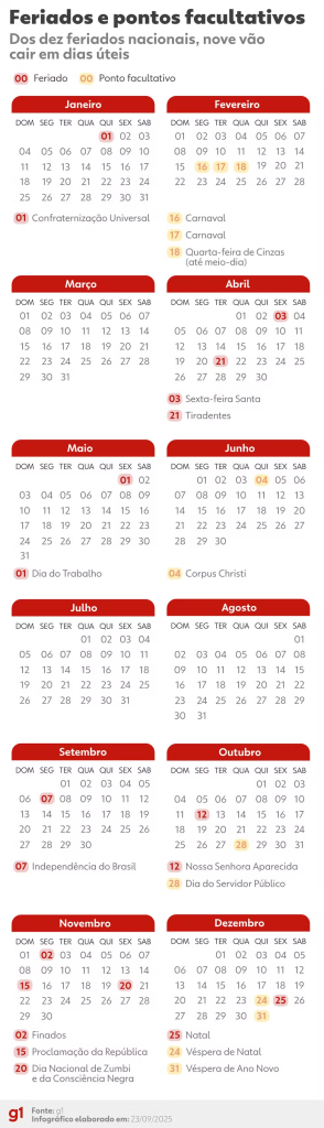 Dos dez feriados nacionais, nove vão cair em dias úteis Escolástico Paulino30 de setembro de 2025 Menos de um minuto Mostrar mais