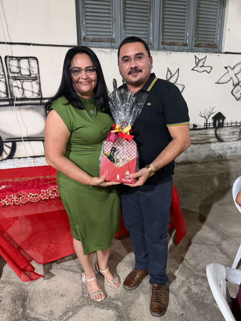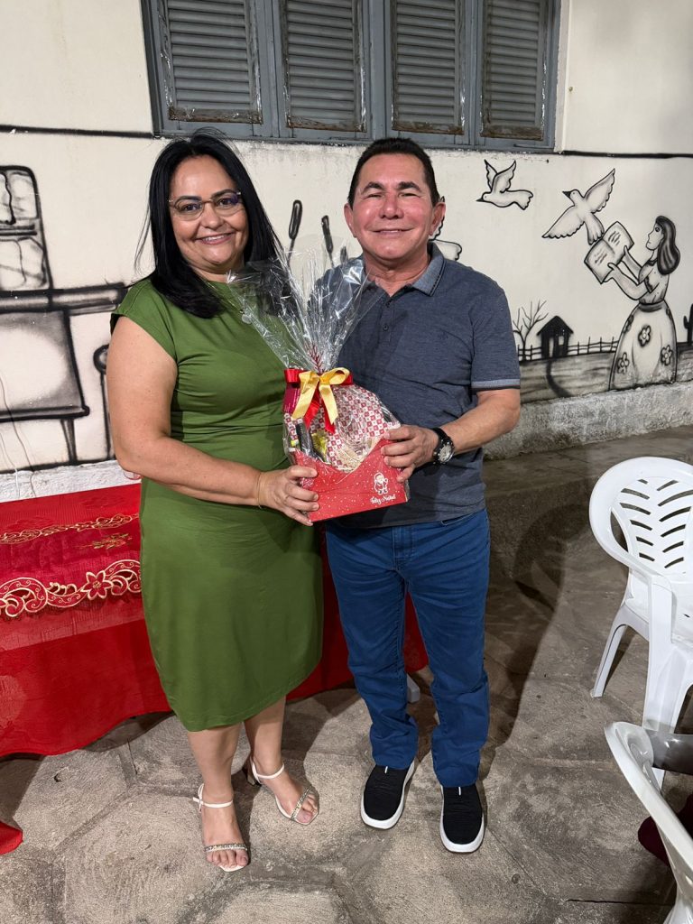 Na foto a seguir, Edilma entrega presente a Escolástico