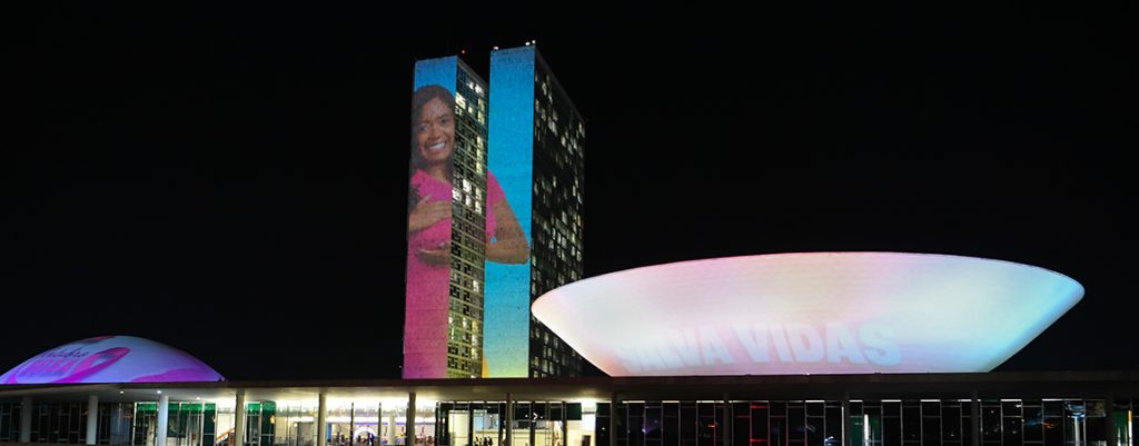 Projeção na fachada do Palácio do Congresso alusiva à campanha Outubro Rosa