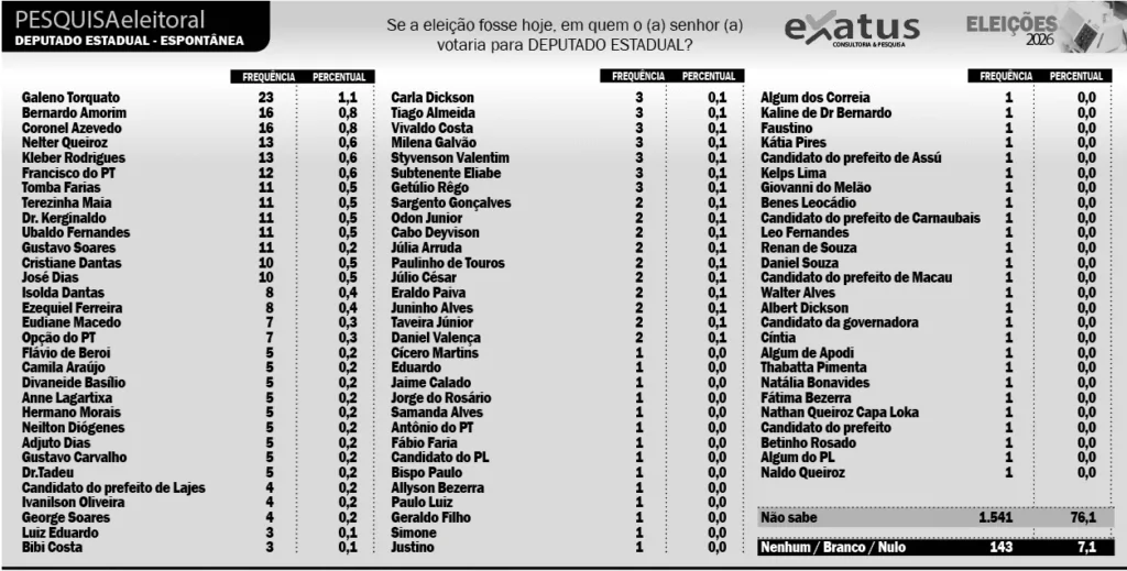 Pesquisa realizada pelo Instituto Exatus mostra um cenário ainda marcado por grande indefinição do eleitorado na disputa para deputado estadual nas eleições de 2026. De acordo com os dados, 76,1% dos entrevistados disseram não saber em quem votar, enquanto 7,1% afirmaram que não escolheriam nenhum candidato ou votariam branco/nulo.